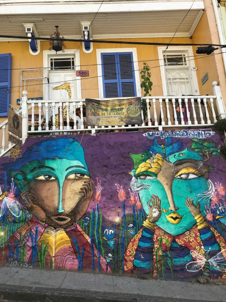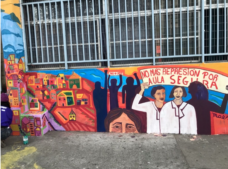 A mural on the outside of a public high school in Valparaíso. Aula Segura refers to a national law in Chile which high school students have protested because of increased police presence and repression in schools. No más repression por aula segura means “no more repression by the Safe Classroom law.”